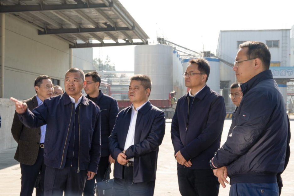 在公司年产3万吨高纯度结晶赤藓糖醇项目现场,董事长陈德水向夏盛民书记介绍公司发展情况及新项目建设情况。