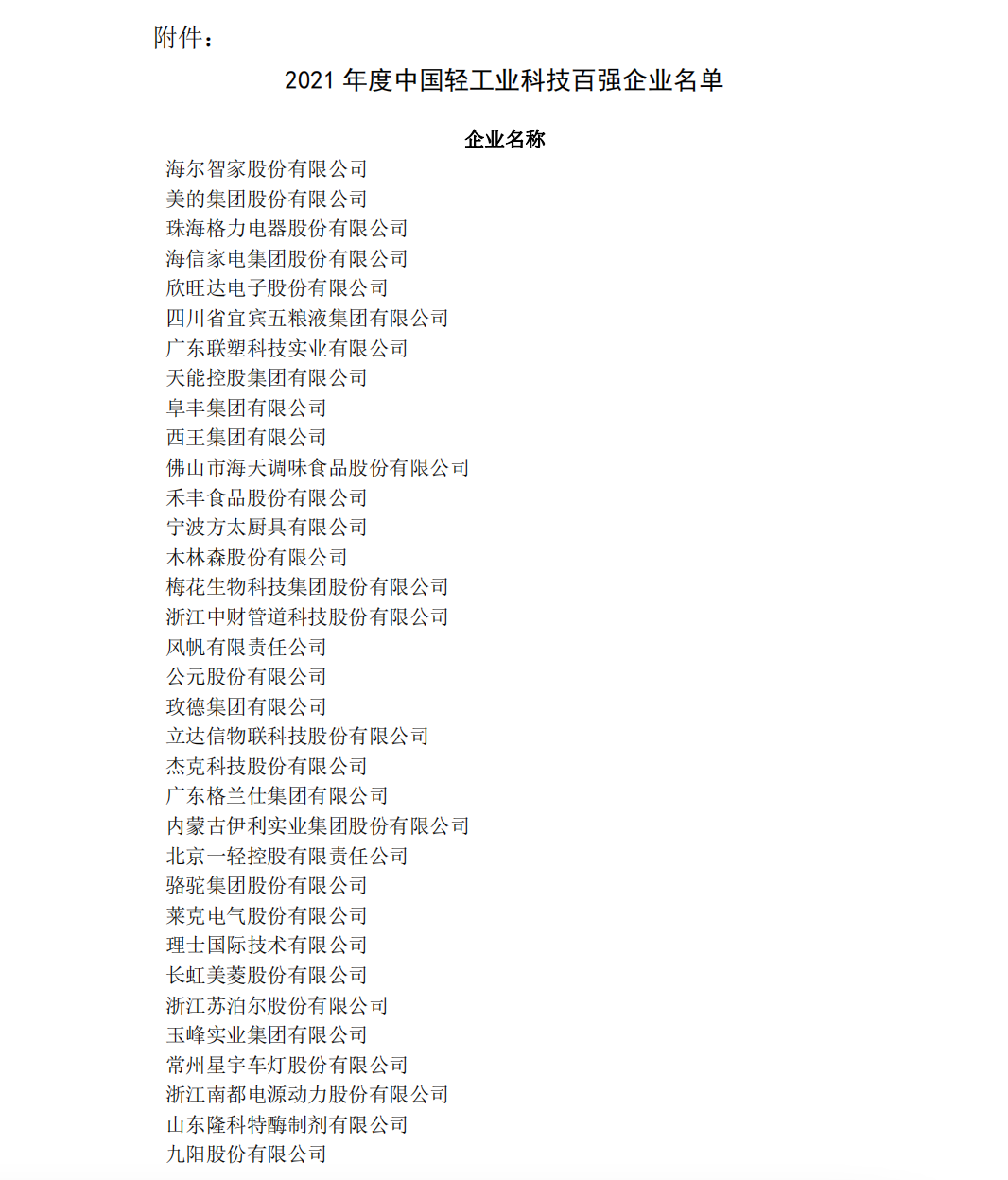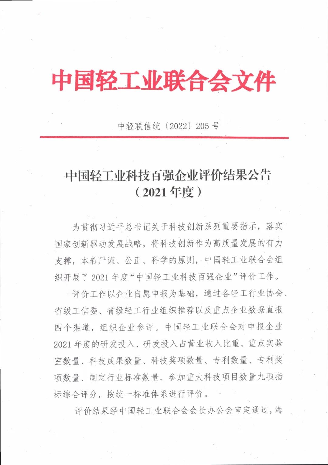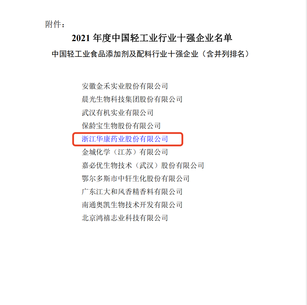 近日,中国轻工业联合会发布了2021年度中国轻工业十强企业等评价结果公告,华康股份荣获“中国轻工业食品添加剂及配料行业十强企业”“中国轻工业科技百强企业”称号。
