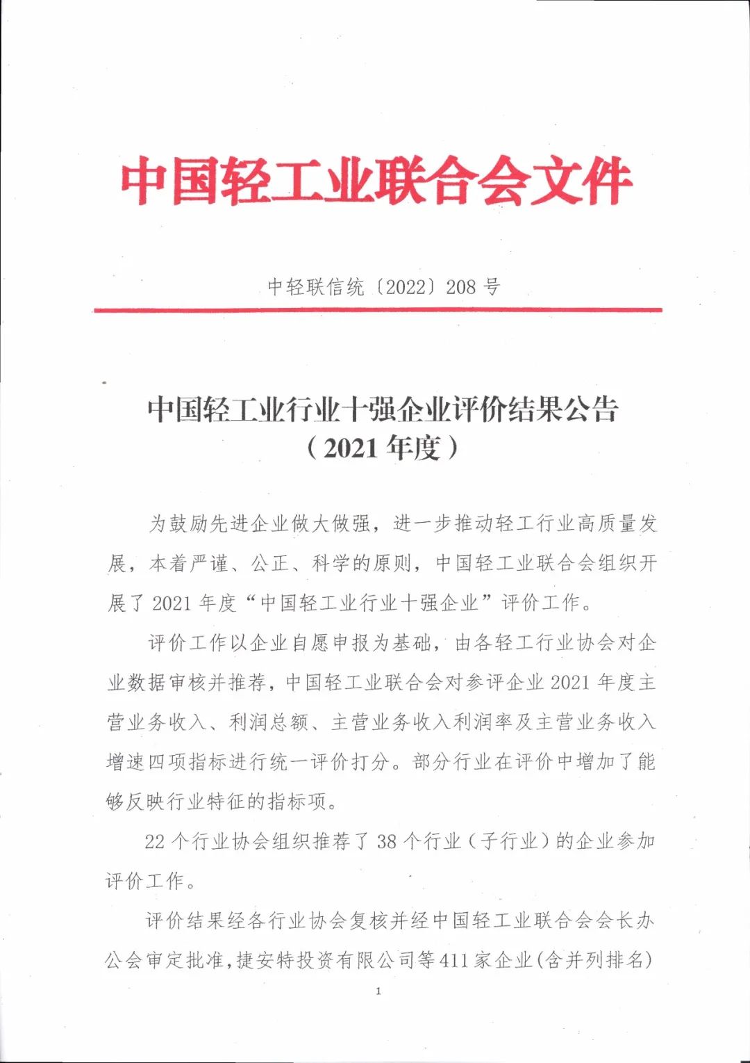 中国轻工业联合会是轻工业全国性、综合性,具有重要影响、服务和管理职能的行业组织。为促进轻工业企业提高竞争力,做强做大做优,中国轻工业联合会每年开展行业十强企业等评价工作,评价榜单是衡量中国轻工业企业发展活力的重要标准。